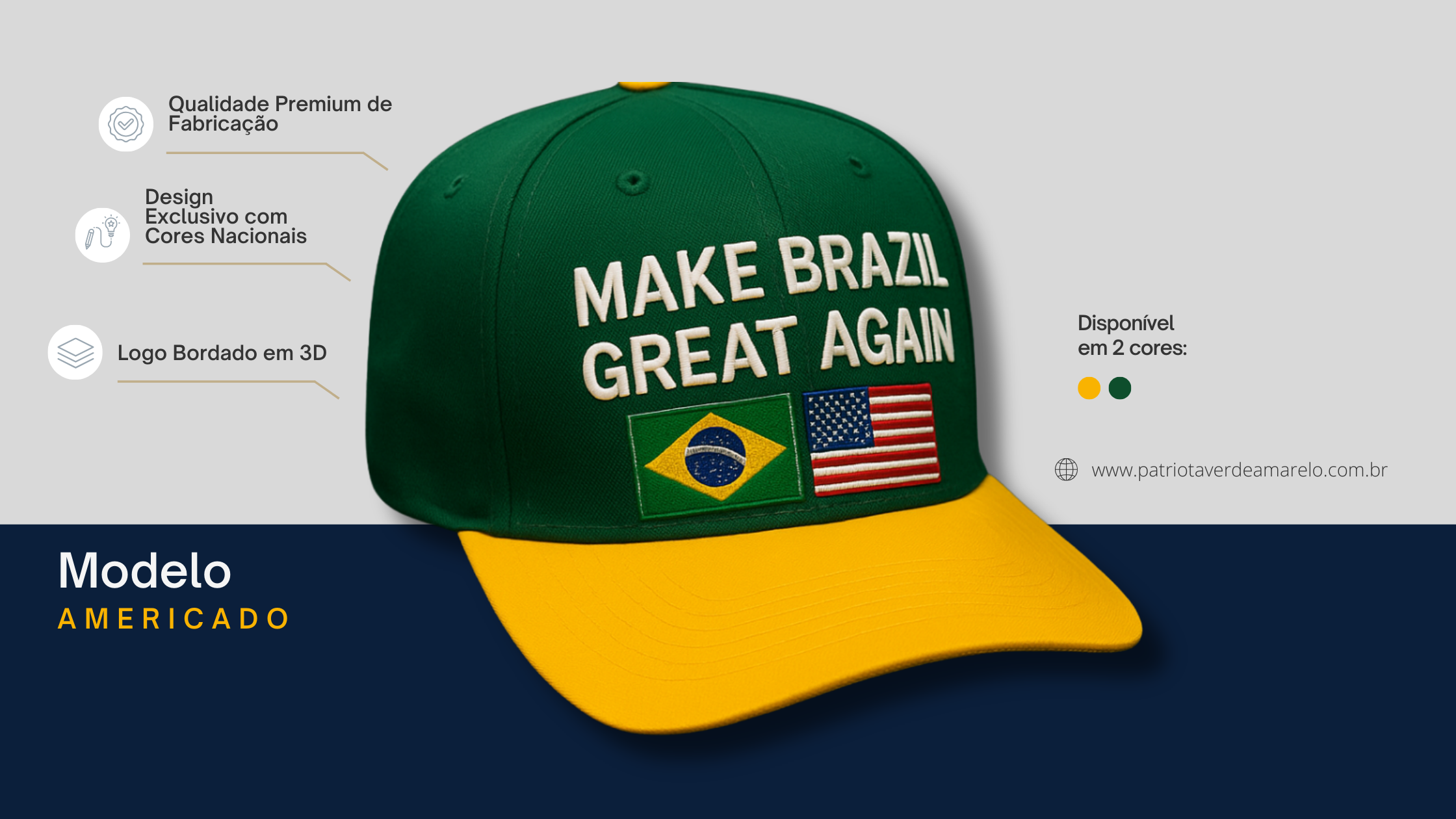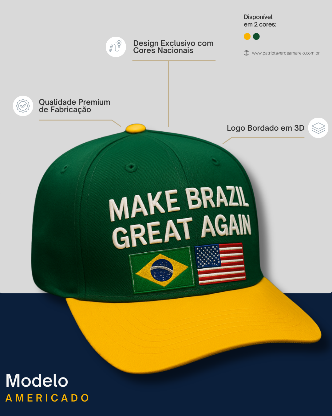 Cada detalhe do Boné Patriota Verde Amarelo foi projetado com precisão — da escolha do tecido ao bordado em 3D — para entregar um produto que une conforto, durabilidade e identidade nacional.